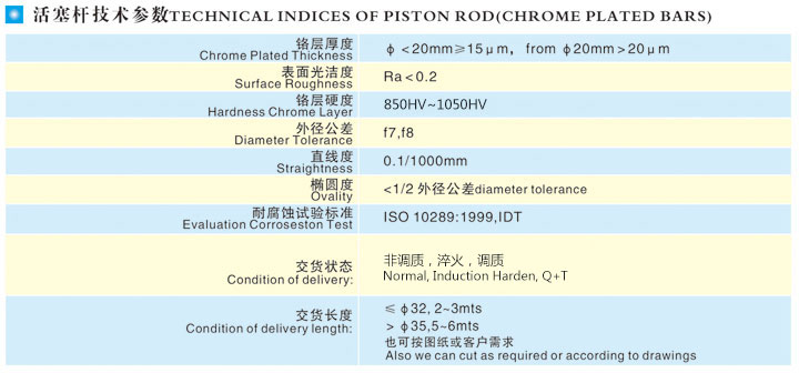 本產(chǎn)品表面經(jīng)特殊研磨及硬鉻電鍍技術(shù)外理,再經(jīng)鏡面拋光而成,具有耐磨擦、抗腐蝕性特性,可用作各種氣缸、油缸、包裝機(jī)械、木工機(jī)械、紡織機(jī)械、印染機(jī)械、壓鑄機(jī)、注塑機(jī)及其它機(jī)械的導(dǎo)桿、頂桿。